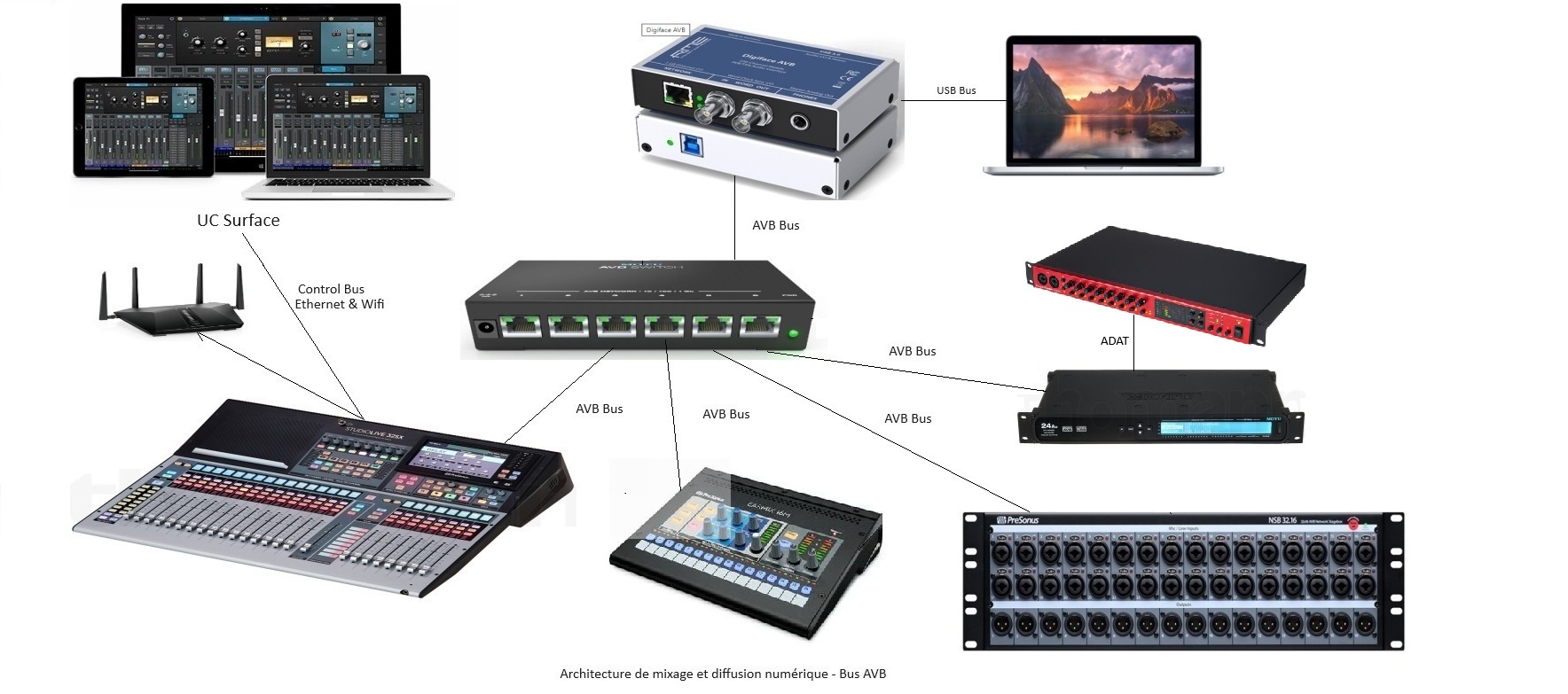 Configuration Digiface_AVB + StudioLive 32SX Presonus + 24AO Motu + NSB32-16 Presonus